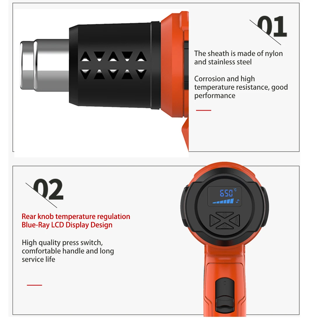 (digital display heat gun)With the function of delayed shutdown, the hot air gun continues to blow cold air to cool the heating core, protect the heating core and prolong the service life